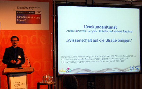 Dort treten wir während des BMBF-Zukunftskongress Demografie „Technik zum Menschen bringen“ am Dienstag, 22. Oktober um 11:30 mit unserem Beitrag „Interaktivität und Spontaneität – Ein künstlerischer Roboter“ auf. Und mit dabei ist natürlich unsere 10sekundenKunst!